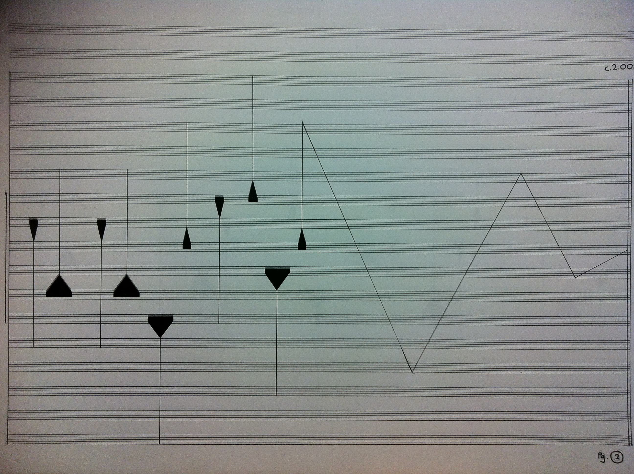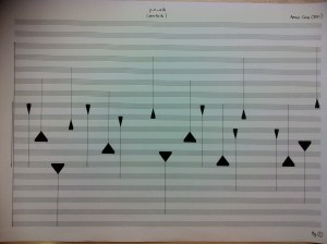 p.n-alk, or pentalk, is an electroacoustic piece written for the pen and paper. The sounds of the pen clicks and writing on a thin sheet of paper on a wooden desk are recorded and manipulated on the computer to produce this short piece of music. Listen (with ear/headphones for a full aural experience) once with your eyes closed and try to imagine the soundscape that is created. Then listen again while referring back to the score (shown below). All scores are handwritten and everything in the score is drawn and created to scale eg. spaces, shapes, etc.